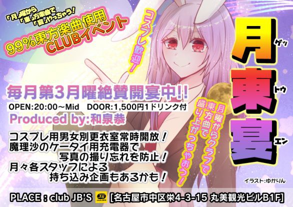 OPEN: 20:00 – 01:00 GENRE: 東方 PRICE: DOOR 1500YEN (incl.1D) Produ...