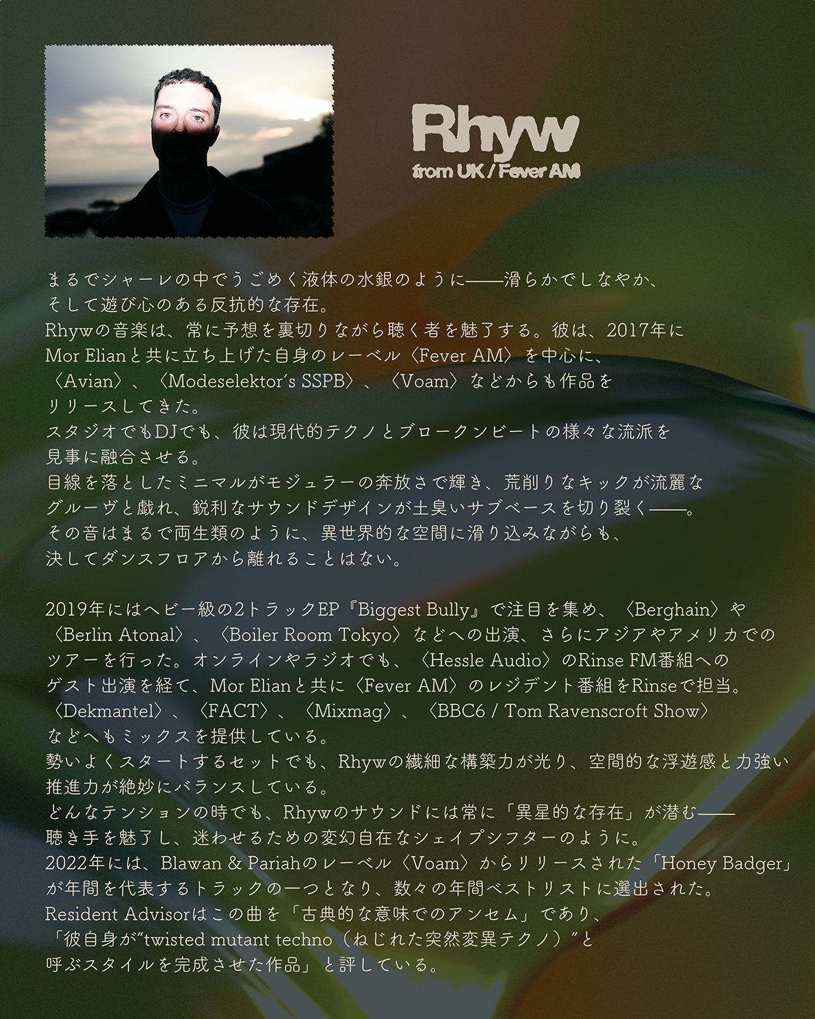 クラブプレイにおける優れた機能性と、独創的でユーモアを含みながらも洗練された展開のアイデアが高次元の音響芸術として結実した楽曲を数多く輩出する、UKのレーベルを主催するDJ・プロデューサーであるRhywが名古屋club JB’Sに初登場。