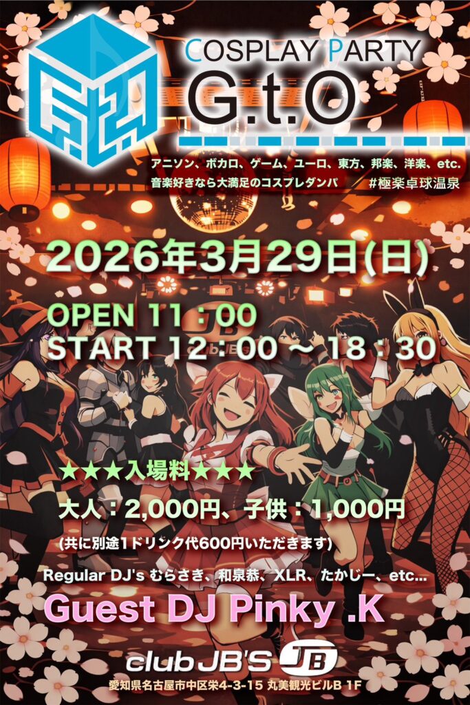 INFOMATION OPEN 11:00 – 18:30 GENRE: コスプレ PRICE: DOOR 2000YEN (+1D/600YEN) GUEST DJ: Pinky. K DJ: むらさき, 和泉恭, たかじー, XLR