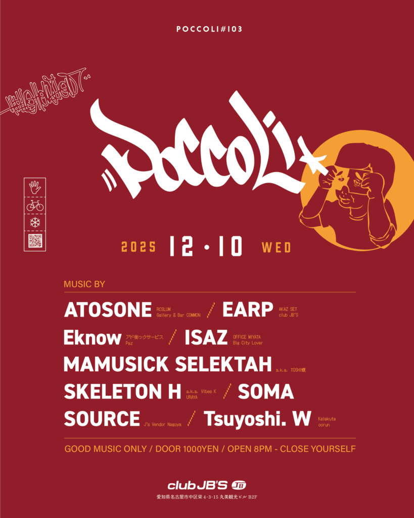 CAST: ATOSONE (RCSLUM / Gallery & Bar COMMON), Tsuyoshi. W (Kalakuta / oorun), ISAZ (OFFICE MIYATA / Big City Lover), SKELETON H (URAYA), SOMA, SOURCE (J’s Vendor Nagoya), Eknow (アド街ックサービス / Puz), MAMUSICK SELEKTAH (a.k.a. TOSHI蝮), EARP (AKAZ SET / club JB’S)